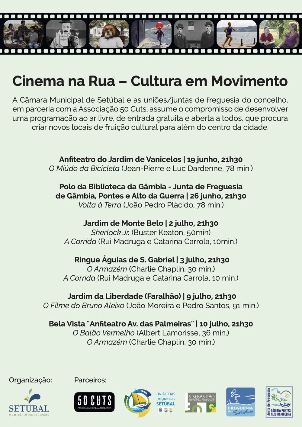 O Concelho terá um total de seis sessões de cinema, voltando à União das Freguesias de Setúbal em 3 de julho, no Ringue do Águias de São Gabriel, com as películas "O Armazém" (Charlie Chaplin, 30 min.) e "A Corrida" (Rui Madruga e Catarina Carrola, 10 min.).